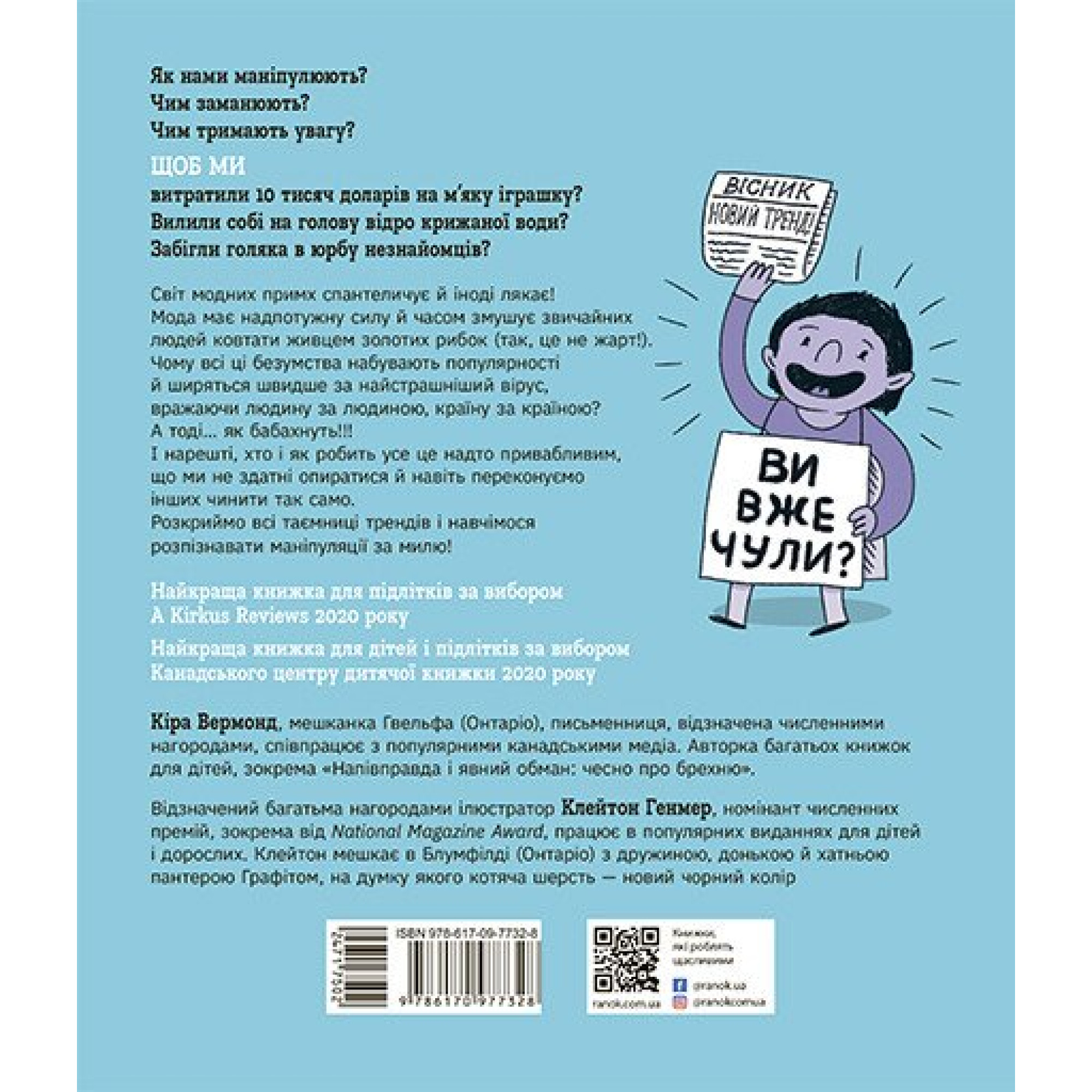 У книзі «Тренди: як вони виникають, поширюються й вибухають» авторка Кіра Вермонд розбирає культурні, економічні й психологічні чинники, які ховаються за модними захопленнями — від Crocs до TikTok. Завдяки дотепному стилю та яскравим ілюстраціям Клейтона Генмера, ця книга стане справжнім відкриттям не лише для підлітків, а й для дорослих!