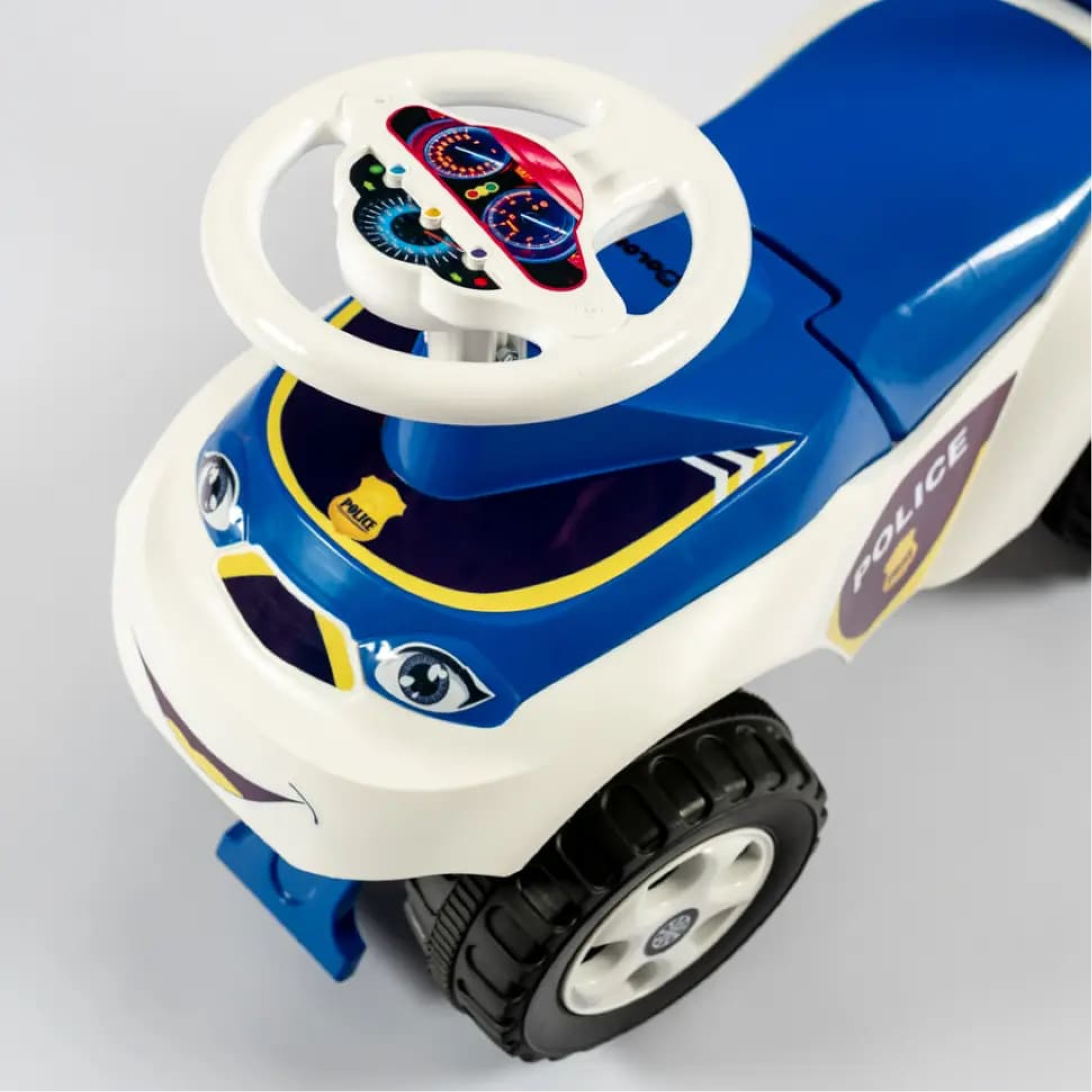 Це яскрава, зручна та безпечна іграшка, дитина може кататися, відштовхуючись ніжками, або використовувати машинку як опору під час перших кроків, штовхаючи її перед собою.