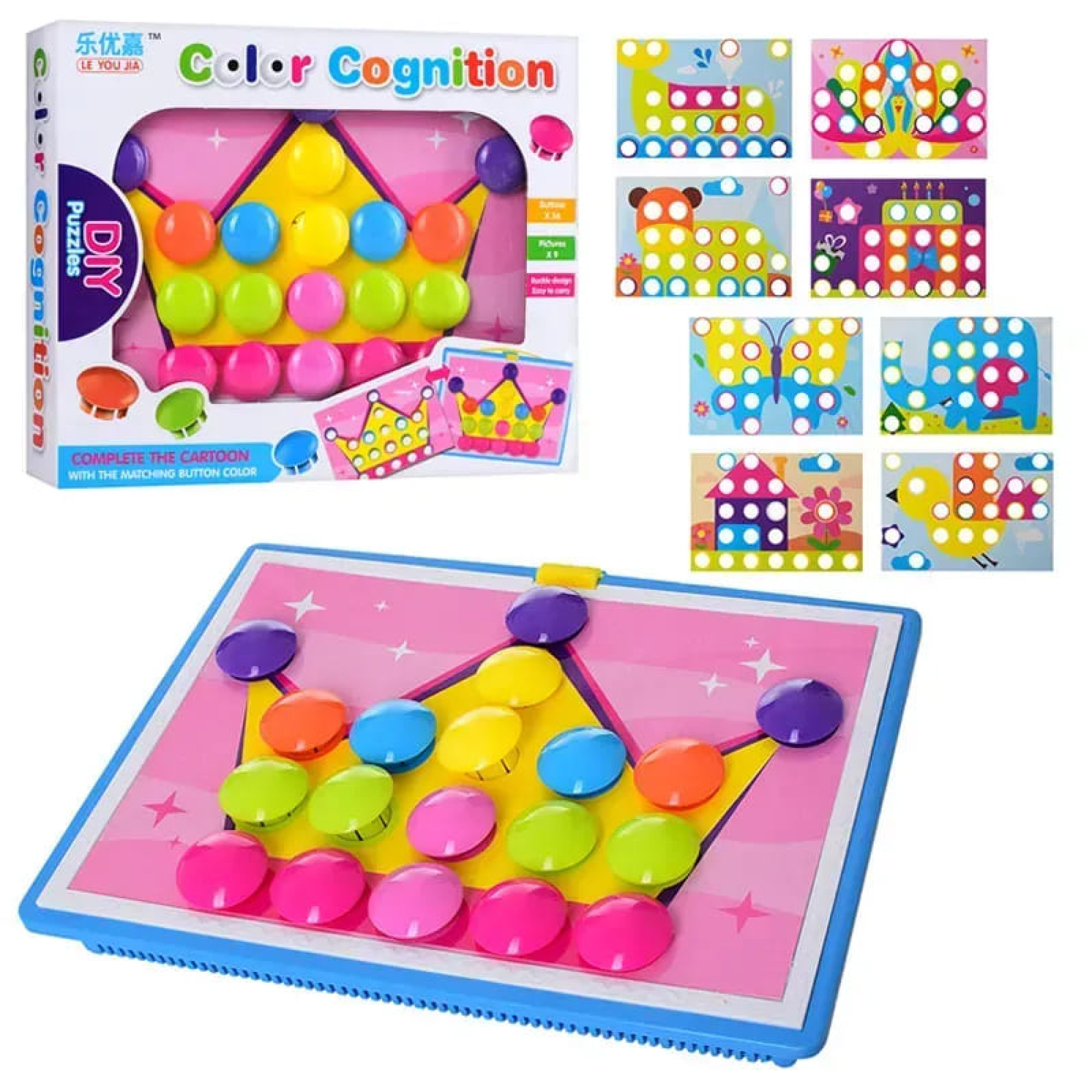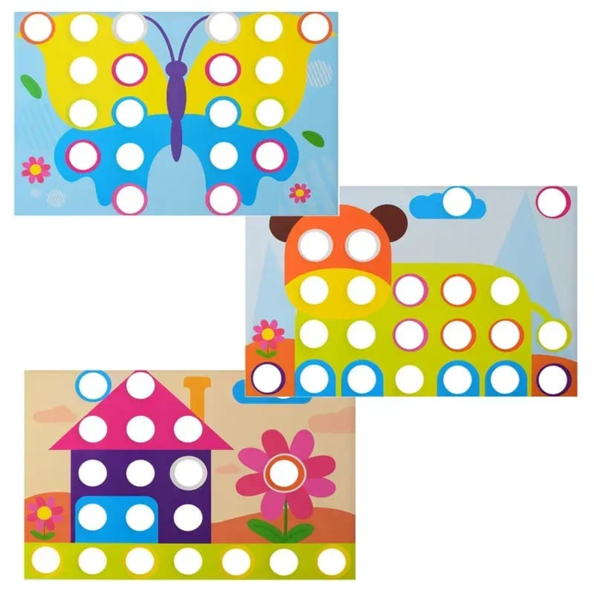 Яскрава дитяча кнопкова мозаїка — це розвивальна іграшка, яка допомагає малюкам знайомитися зі світом кольорів, форм і творчості. Під час гри дитина вставляє кольорові кнопки у спеціальні отвори на ігровій панелі та створює яскраві зображення за готовими картками або власною фантазією.