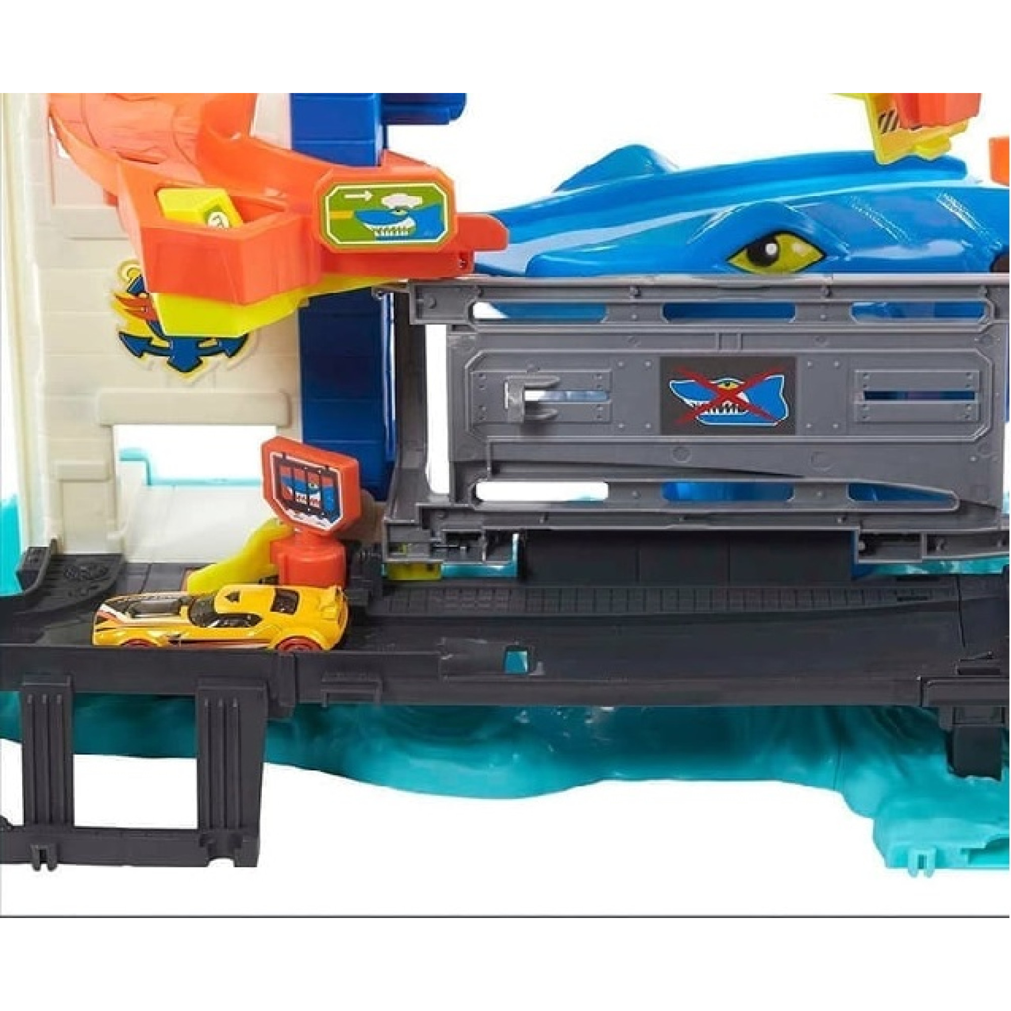 Підніміть ручний ліфт на верхній рівень стоянки та спустіть машинку вниз по рампі, щоб подразнити голодну акулу. Три активатори навмання приводять акулу в дію, так що ви не знатимете, коли саме вона нападе. Доберіться до кінця треку, щоб акула потрапила в клітку, і продовжуйте безперешкодно кататися, не побоюючись нападу.Дослідіть додаткові функції треку та з'єднуйте його з іншими наборами Hot Wheels, щоб пригоди тривали довше.