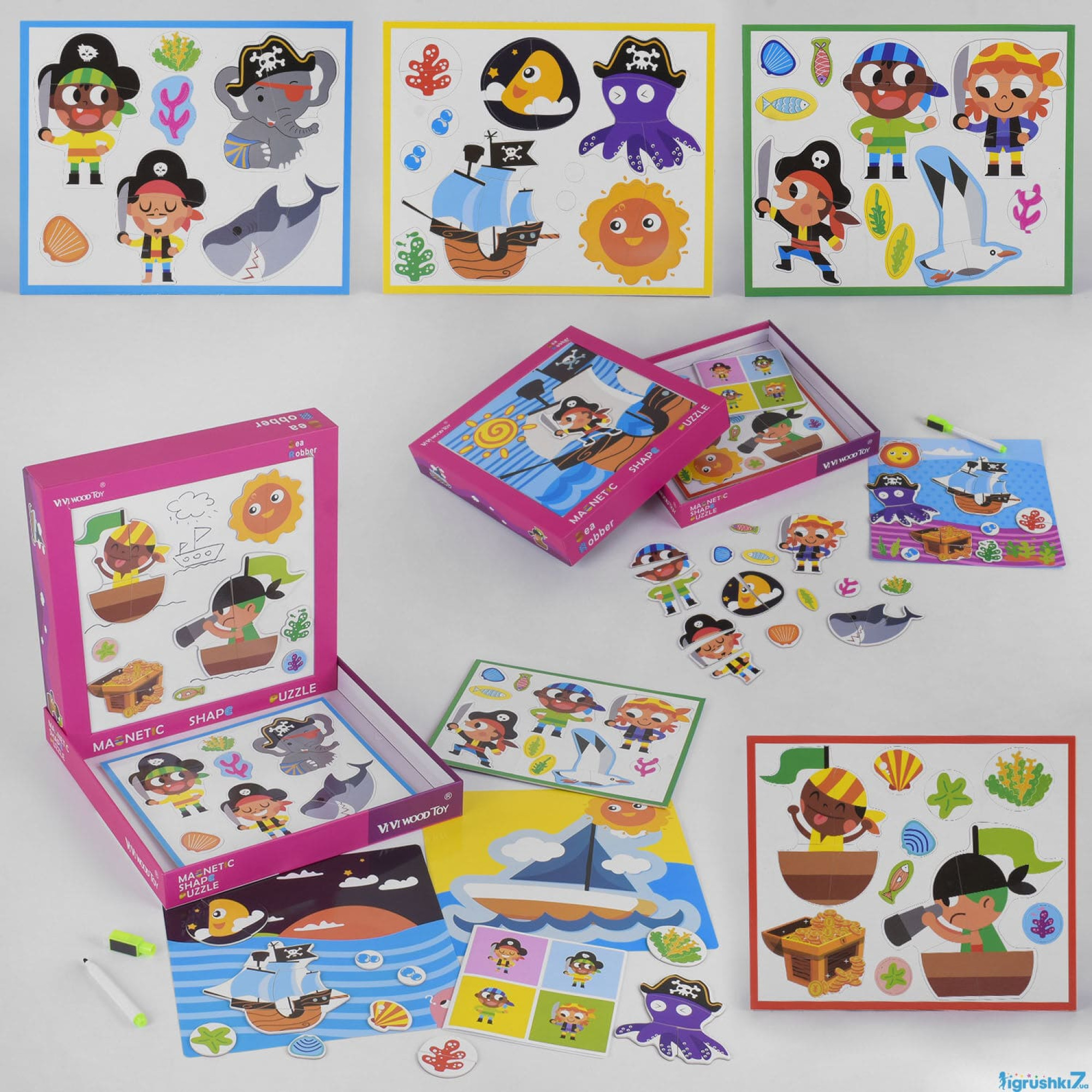 - Комплектація: Магнітні пазли, маркер на водній основі, дошка для малювання