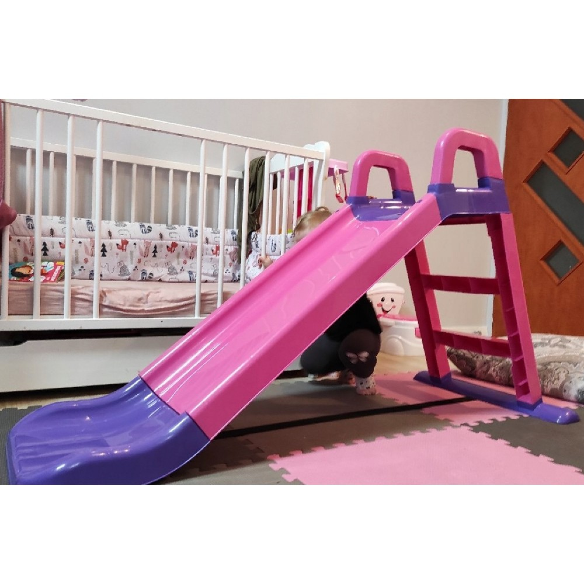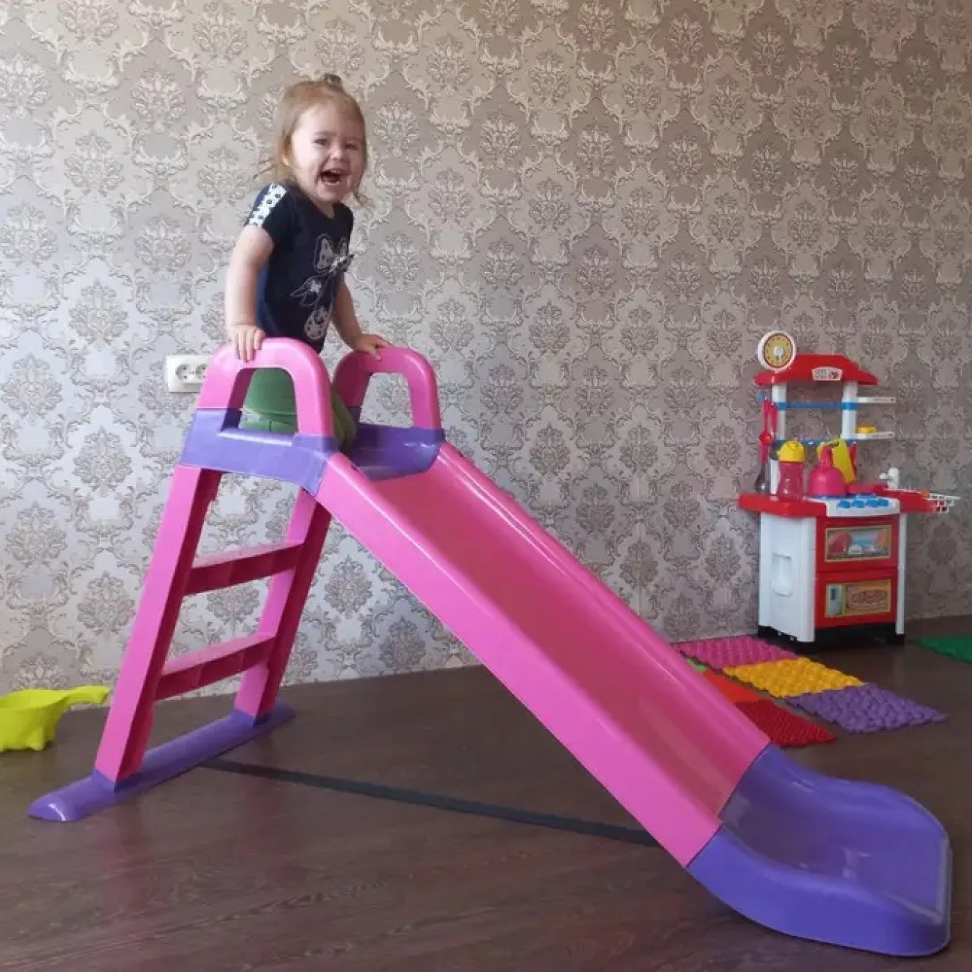 Дитяча гірка для катання має гладку поверхню з невеликим нахилом, що дозволяє дітям легко забиратися на неї та спускатися вниз. Довжина спуску 140 см забезпечує дітям відчуття швидкості, але при цьому не є надто високою, щоб дитина почувалася некомфортно. Для зручності та безпеки передбачені бортики, за які дитина може триматися.
